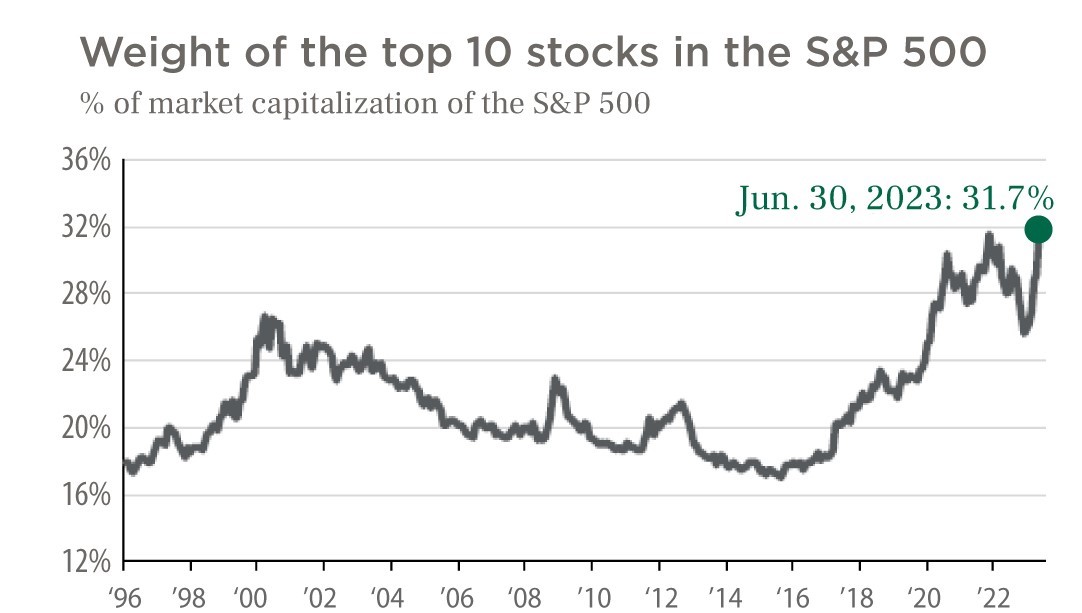 As is always the case in the early days of a new calendar year, predictions on stock market performance entering 2023 were pervasive and dominated financial media. In January 2023, the optimism/pessimism dispersion of predictions was especially wide as bulls were making the case for a strong rebound from the declines in 2022 while bears were pointing to the dark clouds of recession. At the midpoint of 2023, clearly the bulls’ positive predictions are in the driver seat (so far), given the strong rebound in the S&P 500 and the historically strong uptrend in Nasdaq. But looking “under the hood” of the indices, driving this strength is disproportionately high contributions from a few stocks which include Apple, Microsoft, Nvidia, Meta (formerly Facebook), Alphabet, just to name a few. In fact, the top 10 stocks in the S&P 500 as of June 30th, 2023, now comprise almost 32% of the S&P 500 index’s value, a multi-decade high.
